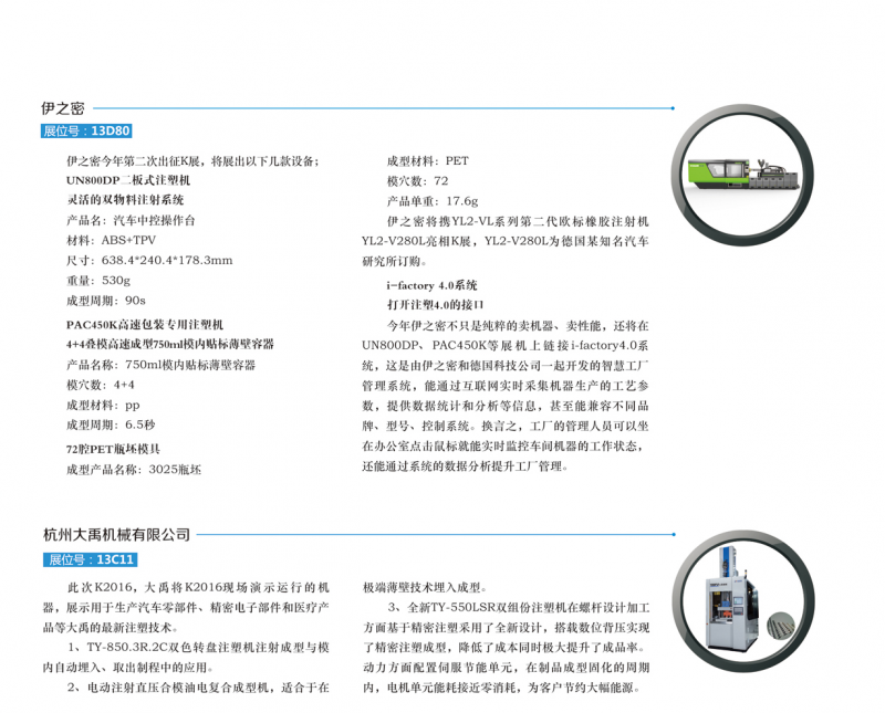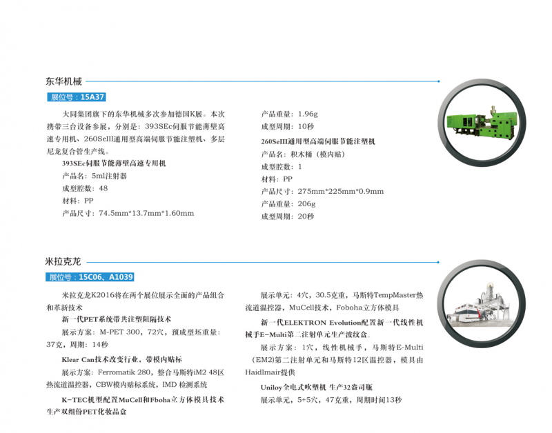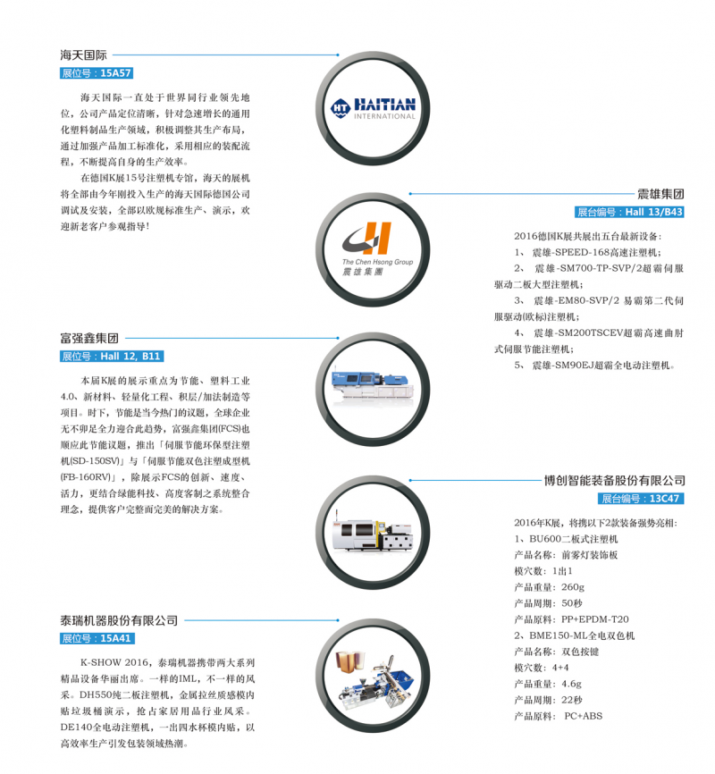本屆盛會參展商來自59個國家,共3220家廠商參展。其中中國的參展商368家,匯集橡塑機械、設備、原料、輔助材料、半成品、工業(yè)組件及強化塑料等所有相關產(chǎn)品與服務,共使用19個展館。本屆中國企業(yè)將重點展示節(jié)能、塑料工業(yè) 4.0、新材料、輕量化工程、自主研發(fā)、積層/加法制造等項目。