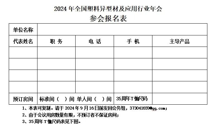 經(jīng)研究并報(bào)請(qǐng)中國(guó)塑料加工工業(yè)協(xié)會(huì)批準(zhǔn),專委會(huì)定于2024年9月19-21日在浙江·杭州·華盛達(dá)雷迪森廣場(chǎng)酒店召開“2024 年全國(guó)塑料異型材及應(yīng)用行業(yè)年會(huì)”。報(bào)到日期為9月19日。