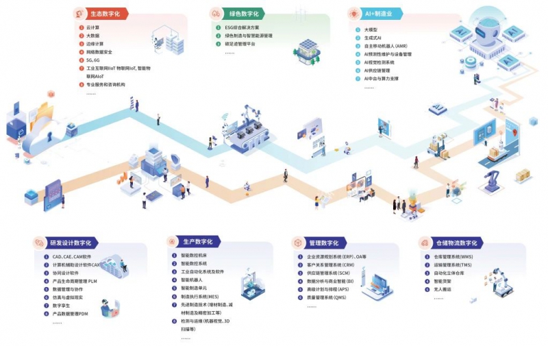 從管理數(shù)字化(ERP、CRM等系統(tǒng))、生產(chǎn)數(shù)字化(智能機床、工業(yè)機器人等)到綠色數(shù)字化(ESG解決方案、碳足跡管理等),涵蓋研發(fā)設計、生產(chǎn)制造、倉儲物流等全環(huán)節(jié),全方位展示數(shù)字化轉型成果。