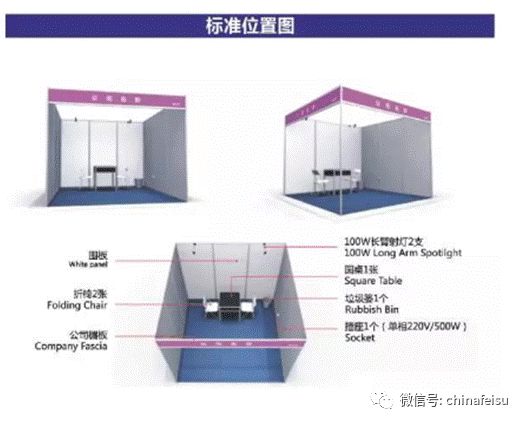標(biāo)準(zhǔn)配套:三面圍板,企業(yè)楣板,一張洽談桌,兩把折椅,兩支射燈,一個紙簍,一個220V/5A插座(特殊用電須向展館申請,另行收費)