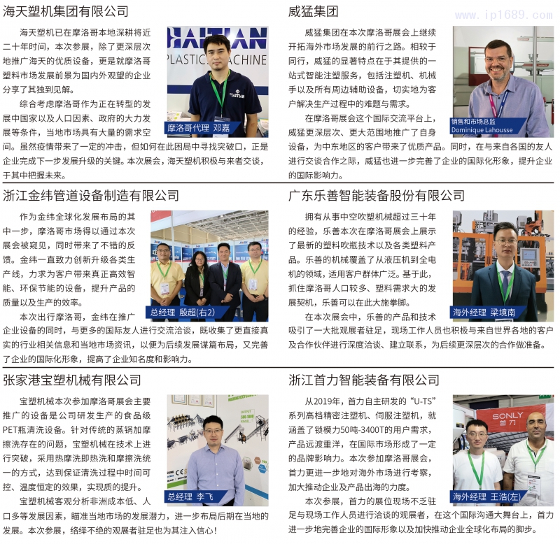 試圖尋求海外新發(fā)展市場和新合作機會的各大小企業(yè),自然不會忽視Plast expo這個溝通交流的國際平臺。此次展會,包括海天、金緯、文穗、樂善、寶塑、首力等在內(nèi)的各大知名企業(yè)重磅登場,在摩洛哥這片土地上尋找企業(yè)進一步發(fā)展的突破口。