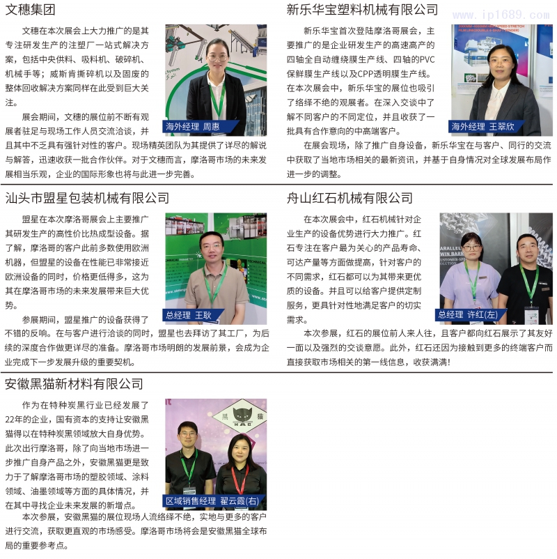 寶塑在已合作了個別當(dāng)?shù)鼐哂袑嵙Φ睦峡蛻艋A(chǔ)上,借由本次展會對摩洛哥市場進行考察。結(jié)合行業(yè)上下游的發(fā)展以及當(dāng)?shù)厝丝谶@一重要因素,判斷市場未來發(fā)展前景可觀。而文穗作為新涉足此地域的國內(nèi)優(yōu)秀企業(yè),展會現(xiàn)場同樣情況樂觀,并迅速收獲有合作意向的客戶!