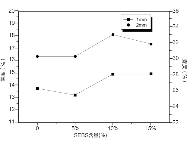 采用氫化聚苯乙烯-丁二烯-聚苯乙烯嵌段共聚物(SEBS)改性抗沖透明聚丙烯(PP),經(jīng)雙螺桿熔融共混制備得到透明PP/SEBS共混物,研究了SEBS的添加量對(duì)抗沖透明聚丙烯力學(xué)性能和霧度的影響。
