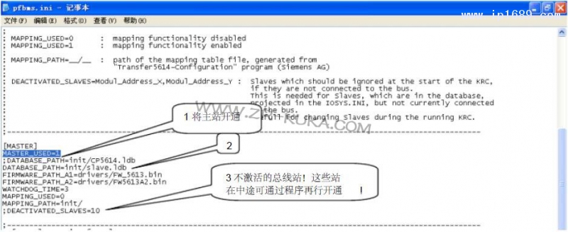 二、將C\KRC\Roboter\Init 文件夾內(nèi)的pfbms.ini 文件打開(kāi),并設(shè)置相應(yīng)參數(shù)。