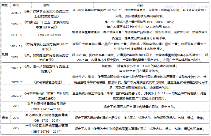 表 1 中國關(guān)于農(nóng)膜的相關(guān)政策及標準