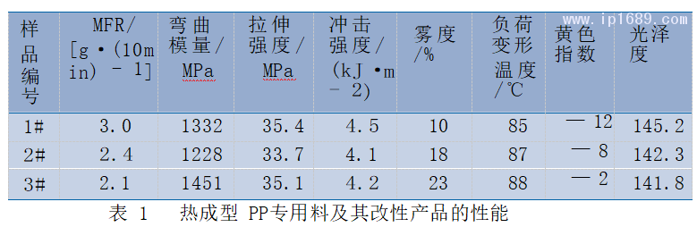 目前 ,市場(chǎng)上的熱成型PP專(zhuān)用料MFR為2.0~ 3.0g/10min,兼顧加工速率和熔體強(qiáng)度,主要分為均聚產(chǎn)品和無(wú)規(guī)產(chǎn)品,采用 Z-N催化劑,配 合硅烷類(lèi)外給電子體進(jìn)行生產(chǎn),部分下游廠家在生產(chǎn)前對(duì) MFR為0.1~ 10.0g/10min的常規(guī)PP產(chǎn)品進(jìn)行了增剛或增透改性[8-10]。 目前,國(guó)家對(duì)一次性塑料制品頒布多項(xiàng)限制規(guī)范政策, 同時(shí)對(duì)包裝材料的健康要求越來(lái)越高。薄壁制品回收后性能下降過(guò)多,很難進(jìn)行循環(huán)應(yīng)用,因此,下游廠家響應(yīng)政策引導(dǎo),逐步傾向于使用低MFR的熱成型PP專(zhuān)用料,其制品滿(mǎn)足熱水消毒及回收再利用的要求[11]。根據(jù)市場(chǎng)調(diào)研要求,對(duì)市場(chǎng)上的PP產(chǎn)品進(jìn)行分析評(píng)價(jià)。調(diào)研發(fā)現(xiàn) :為了滿(mǎn)足熱成型加工中高熔體強(qiáng)度的需求,該類(lèi)專(zhuān)用料的 MFR普遍不高,改性方式是將均聚PP和無(wú)規(guī)共聚PP按照一定質(zhì)量比共混,添加少量增剛增透助劑 。 熱成型 PP專(zhuān)用料(1#) 及其改性產(chǎn)品(2#和3#)的性能如表1所示,其中,光澤度是在入射角60°時(shí)測(cè)得。