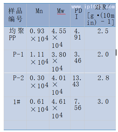 合作廠家采用設(shè)計(jì)的配方1和配方2對(duì)均聚PP進(jìn)行改性,產(chǎn)品分別命名為 P-1,P-2,然后用作熱成型PP產(chǎn)品的原料。產(chǎn)品的MFR及GPC分析如表3所示。