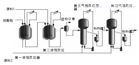 現(xiàn)有常規(guī) PP工藝中, HypolPP工藝的平均停留時(shí)間最長(zhǎng),較長(zhǎng)的反應(yīng)時(shí)間可以充分釋放催化體系的活性,有利于調(diào)控各反應(yīng)釜的工藝參數(shù),可以合理分配產(chǎn)品MFR和乙烯共聚性能,有利于剛韌平衡和無(wú)規(guī)聚合的匹配。圖1為HypolPP工藝示意 。