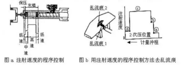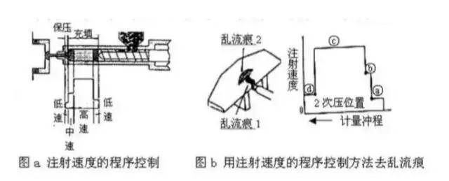 如圖b,就采用了在注射的初期使用低速,模腔充填時(shí)使用高速,充填接近終了時(shí)再使用低速注射的方法。通過(guò)注射速度的控制和調(diào)整,可以防止和改善制品外觀如毛邊、噴射痕、銀條或焦痕等各種不良現(xiàn)象。