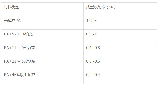 工程師告訴我們,玻纖加入量越多,尼龍樹(shù)脂的成型收縮率越小。但是玻纖加多了會(huì)造成表面浮纖、相容性差等后果,一般加30%效果相對(duì)較好。下表是一份經(jīng)驗(yàn)得到的“玻纖-成型收縮率”表:
