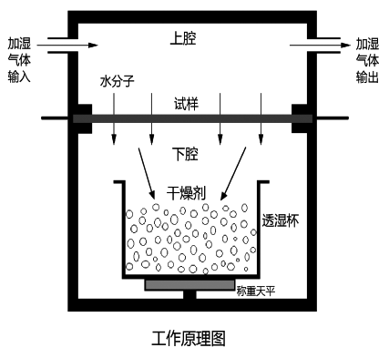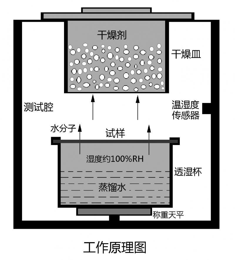 杯式法:把試樣固定在測(cè)試腔中間將測(cè)試腔分上下兩個(gè)腔,相對(duì)穩(wěn)定濕度的氣體在薄膜的上腔流動(dòng),下腔放置吸收濕氣的干燥裝置,水分子透過(guò)試樣擴(kuò)散到下腔,被干燥劑吸收,通過(guò)稱重傳感器測(cè)量干燥裝置的重量,從而計(jì)算出水汽透過(guò)量。