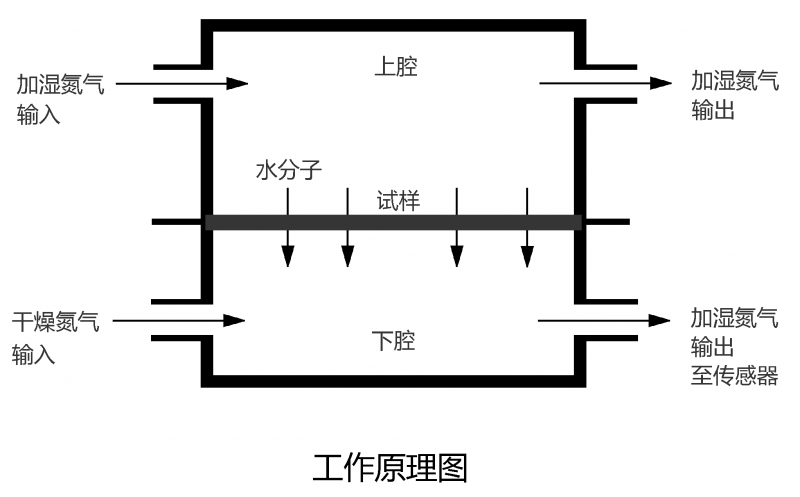 紅外法:采用紅外傳感器測(cè)試原理。將預(yù)先處理好的的試樣固定在測(cè)試腔中間,把測(cè)試腔分為上下兩個(gè)腔,相對(duì)穩(wěn)定濕度的氮?dú)庠诒∧さ纳锨涣鲃?dòng),干燥氮?dú)庠谙虑涣鲃?dòng);由于濕度梯度的存在,水蒸氣會(huì)從高濕腔穿過(guò)薄膜擴(kuò)散到低濕腔;透過(guò)試樣的水蒸氣被流動(dòng)的干燥氮?dú)鈹y帶至紅外傳感器,通過(guò)傳感器輸出的電信號(hào)得出試樣的水蒸氣透過(guò)率等參數(shù)。
