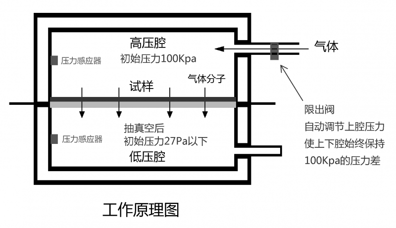 壓差法:將預(yù)先處理好的試樣放置在上下測(cè)試腔之間,在試樣的兩側(cè)形成一個(gè)恒定的壓差,氣體在壓差的作用下,由高壓腔通過(guò)薄膜向低壓腔滲透, 監(jiān)測(cè)低壓腔的壓力變化可計(jì)算出所測(cè)試樣的阻隔參數(shù)。