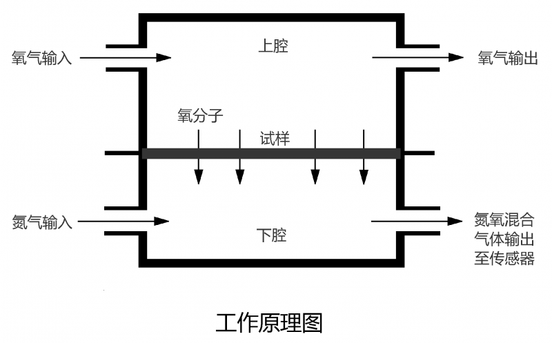 電量法:庫(kù)侖電量法原理,等壓法測(cè)試,測(cè)試腔分上下兩部分,薄膜固定在中間,高純氧氣在薄膜的上腔流動(dòng),高純氮?dú)庠诒∧さ南虑涣鲃?dòng),氧分子透過(guò)薄膜擴(kuò)散到另一側(cè)的氮?dú)庵?,被流?dòng)的氮?dú)鈹y帶至傳感器,通過(guò)對(duì)傳感器測(cè)量到的氧氣濃度進(jìn)行分析,從而計(jì)算出氧氣透過(guò)量。