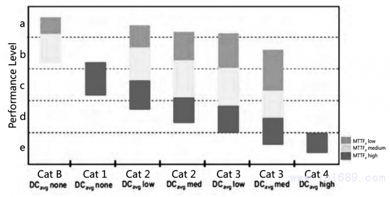 根據(jù)以上所得的Cat、MTTFd、DC、CCF等參數(shù)的值結(jié)合圖表可以得到相應(yīng)的性能等級PL。
