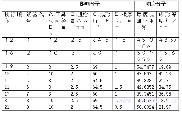 將成形工具頭直徑D?進(jìn)給量ΔZ?成形角θ?板厚t0作為分析因子,將厚度減薄率Φ和成形深度h作為響應(yīng)因子[9]?由于漸進(jìn)成形工藝中進(jìn)給速度v對(duì)成形質(zhì)量影響較小[10],在節(jié)省時(shí)間的前提下,進(jìn)給速度v設(shè)置為2500mm/min?