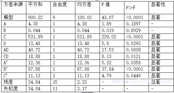 選取二次方模型作為成形深度h的響應(yīng)模型,并對(duì)成形深度h二次方差響應(yīng)模型進(jìn)行方差分析,具體如表2?