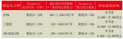 在所有情況下,12個含Harmonite的復合物表現(xiàn)出明顯縮短的混合周期和較低的綜合能耗(表2)。結合其流變儀測試研究數(shù)據(jù),門尼燒焦時間和物理性質,實驗室得出結論,Harmonite在復合物中有著塑化作用。