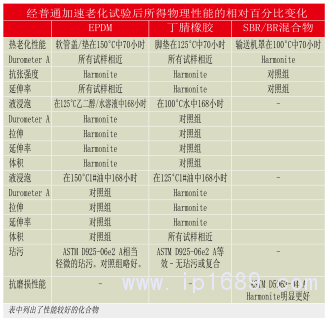 未老化Harmonite配方復合物的物理性能測試已完成,與對照組配方相比,大多數(shù)物性測試顯示出略低。實驗室將略微較低的性能歸因于Harmonite對配方的塑化作用。本試驗對硬度(硬度A)、拉伸、伸長率、模數(shù)、抗撕裂強度、比重和壓縮形變進行了測試??偟膩碚f,在這些應用中,直徑較小的Harmonite 70目產品比Harmonite 40目產品優(yōu)勝。對這些化合物還進行了各種老化研究,包括熱老化、油浸試驗、乙二醇/水溶液浸泡和水浸泡試驗,以及磨損試驗和染色試驗。結果表明,Harmonite 在許多測試中具有相當?shù)纳踔羶?yōu)異的性能; 但在其它情況下,對照組配方優(yōu)于Harmonite配方(表3)。據(jù)研究實驗室稱,任何物理特性的差異都可以很容易地依據(jù)最終用戶期望的性能,通過微調配方來調整。實驗室的結論是,由實驗配方所展示的物理性能將適合于這些應用,或者僅需輕微改變配方。