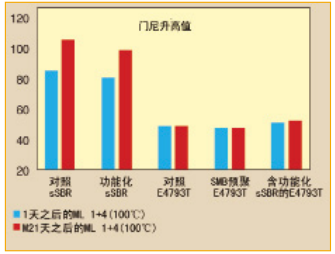 含SMB產品看到的佩恩效應降低類似于功能化sSBR混合物的佩恩效應值。對預聚型和羧基型E4793T,在0℃的損耗角正切(Tan δ)得到改進,而在60℃中,其Tan δ類似于標準溶聚SBR對照組,較功能化組略低。當然,在再混合中,在特定目標性能方面,SMB有很大的靈活性和響應性。
