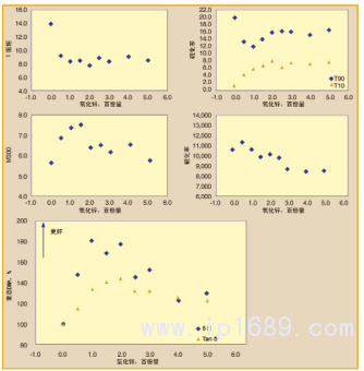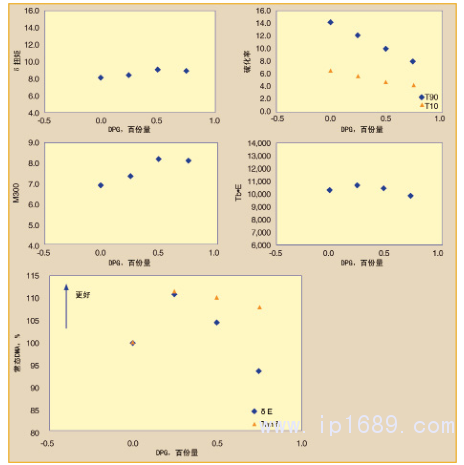 隨著DPG的增加,對焦燒安全性(T10)和佩恩效應(δE′)有負面影響(圖3)。Tanδ(RR)也有類似的趨勢。重要的是要注意到,有來自歐盟REACH法規(guī)淘汰此產品的使用的壓力。
