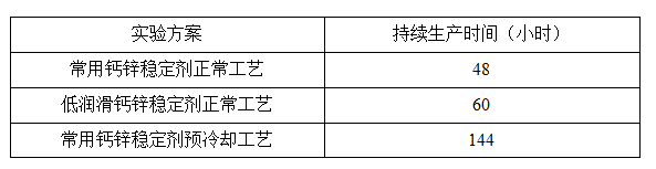 采用相同的配方,采用不同的鈣鋅穩(wěn)定劑,一種為常用鈣鋅穩(wěn)定劑,一種為穩(wěn)定劑廠家特制的低潤滑鈣鋅穩(wěn)定劑,同時比較正常工藝與預(yù)冷卻工藝的不同時生產(chǎn)的持續(xù)時間。