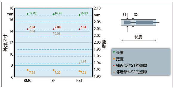 基體的這種低粘度(造成分型線毛邊的主要原因)可用于完全包覆電子部件、線圈架等。壁厚為零點(diǎn)幾至幾毫米的部件都能夠可靠地填充,因此與熱塑性材料相比更具價(jià)值。此外,熱固性模塑材料的低收縮率(圖1)減少了包覆成型后作用于電子部件的內(nèi)部應(yīng)力,正如EP和BMC模塑材料與PBT的比較結(jié)果所顯示的那樣。