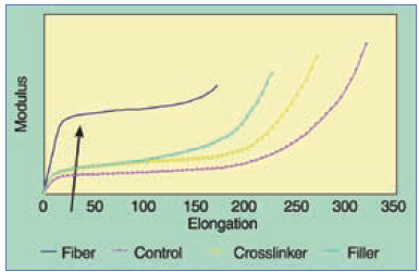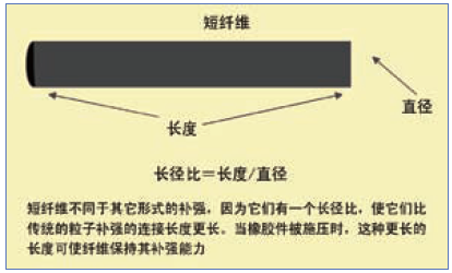 已經(jīng)表明,對于某些應(yīng)用,更便宜的材料可以用來加強橡膠和提供高水平的強度和耐久性。一個很好的例子是使用短纖維增加復(fù)合物理性能,以提供濕態(tài)形狀保持性,降低擠出膨脹,并在整個橡膠產(chǎn)品的使用壽命期間給予所需的強度。短纖維提供的其它性能改進(jìn)是降低了切痕成長和更佳的碎片塊抗性。在許多應(yīng)用中短纖維并未取代簾線增強,但它們的使用已經(jīng)顯示,與簾線結(jié)合,或在簾線缺失時可提高產(chǎn)品的性能。