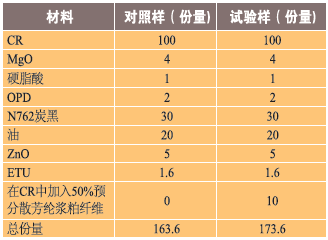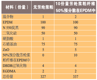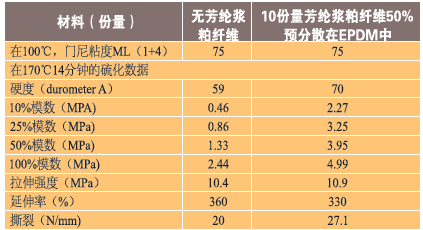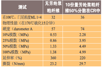 芳綸作為極性材料,將與極性彈性體進(jìn)行最佳的互動。然而,彈性粘結(jié)劑中的預(yù)分散芳綸纖維可以很好地分散這些纖維在極性或非極性彈性體中,如表2~表5所示。表2顯示了一種基于氯丁橡膠的橡膠復(fù)合配方,一種極性彈性體,具有無預(yù)分散芳綸纖維。如表3所示,隨著芳綸纖維的加入,物理性能,包括抗撕裂性得到了改善。