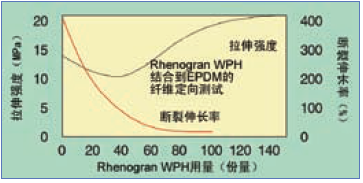 為了生產(chǎn)Rhenogran WP,木漿被粉碎,然后結(jié)合各種彈性體;對于某些產(chǎn)品,添加含間苯二酚-甲醛樹脂。為了最大限度地提高纖維對橡膠的附著力,建議在化合物中加入一個亞甲基供體。最終產(chǎn)品是一種提高了復(fù)合性能,降低了復(fù)合成本的易于分散的母粒。Rhenogran WP再分散作用令其在非極性和極性彈性體中均可分散良好,并在非極性彈性體,如三元乙丙橡膠中實現(xiàn)了最好的分散。木漿纖維添加到橡膠化合物的好處如圖7和8所示。圖7顯示了增加木漿纖維量其抗拉強度顯著增加,伸長率明顯降低。采用ASTM die C方法測量,即使在低負(fù)荷下木漿纖維也改善了抗扯強度(圖8)。
