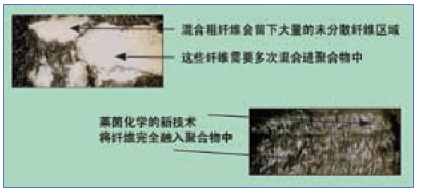 圖10、粗纖維混合與萊茵化學(xué)預(yù)分散摻入技術(shù)的比較