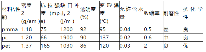 透明塑料首先必須有高透明度, 其次要有一定的強度和耐磨性,能抗 沖擊,耐熱件要好,耐化學性要優(yōu), 吸水率要小,只有這樣才能在使用中,能滿足透明度的要求而長久不變,下面列出表 l,比較一下 pmma、pc 和 pet的 性能。