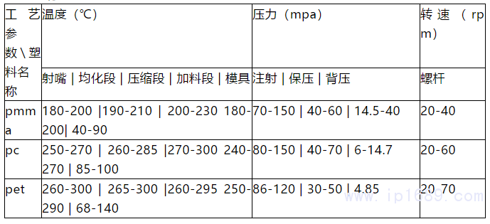 表 3 透明塑料注塑成型工藝參數表:
