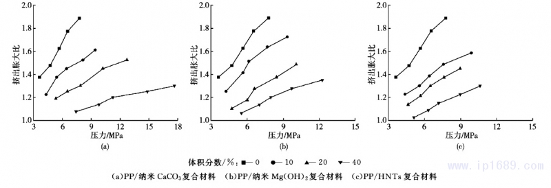 圖3為PP/納米CaCo3復(fù)合體系、PP/納米Mg(OH)2復(fù)合體系、PP/HNTs納米復(fù)合體系分別在填充體積分?jǐn)?shù)為0、10%、20%、40%時,擠出脹大比隨壓力的變化曲線。可以看出,3種復(fù)合材料熔體的擠出脹大比隨著壓力的增加而增大。壓力增加,熔體在毛細(xì)管中的流速加快,熔體在流道中的流經(jīng)時間變少,且如式(2)所示熔體的擠出脹大比隨著熔體在口模內(nèi)流經(jīng)時間的減小呈指數(shù)關(guān)系增加[7]。