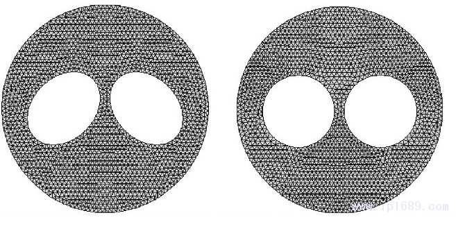 選擇一個(gè)熱傳導(dǎo)方程來(lái)驗(yàn)證共形映射算法的可行性。設(shè)熱傳導(dǎo)方程的求解區(qū)域是類似于圖1中的雙螺桿擠出機(jī)截面的三連通區(qū)域,其中外邊界不隨時(shí)間變化,兩個(gè)內(nèi)邊界繞各自中心旋轉(zhuǎn)。熱傳導(dǎo)方程如下
