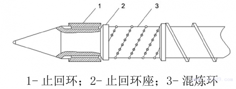 1- 止回環(huán);2- 止回環(huán)座;3- 混煉環(huán)