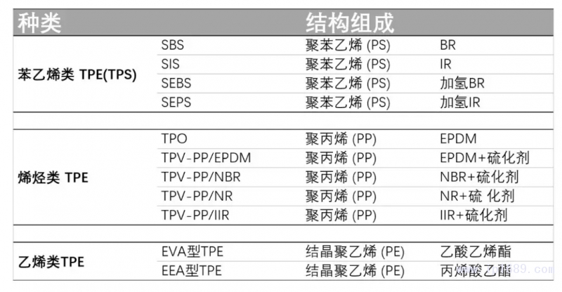 TPE主要由二部分組成,一是塑料,作為連續(xù)相,二是橡膠作為分散相。通常橡膠需要與軟化油或增塑劑與之配合。硫化劑和一些輔助助劑也是必不可少的。另外為了降低成本或者提高某方面的性能,一些無機填料也會被填加。根據(jù)材料組成可分為:苯乙烯類(SBS、SIS、SEBS、SEPS)、烯烴類(TP0、TPV)、雙烯類(TPB、TPI)、氯乙烯類(TPVC、TCPE)、氨酯類(TPU)、酯類(TPEE)、酰胺類(TPAE)、有機氟類(TPF)、有機硅類和乙烯類等,幾乎涵蓋了現(xiàn)在合成橡膠與合成樹脂的所有領域。下面列舉幾種常見的TPE的組成成分。