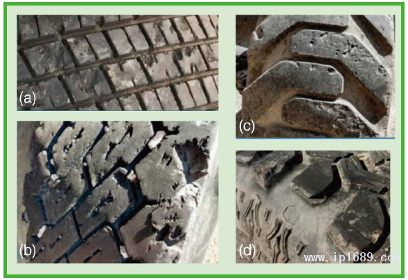 圖1、對(duì)胎面膠不同程度的崩花和切割損傷的示例:全鋼/重型載重汽車輪胎(a)和(b);工程車輛輪胎(c);泥濘地形輕型卡車輪胎(d)