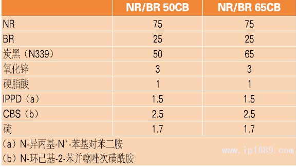 本研究中使用的聚合物為天然橡膠(NR:馬來西亞恒粘膠SMR CV60標(biāo)準(zhǔn)膠)和高順丁二烯橡膠(BR:來自阿朗新科的BUNA CB24釹系稀土順丁橡膠)。補(bǔ)強(qiáng)填料為N339級(jí)炭黑(CB)。所有其他成分均是橡膠級(jí)化學(xué)品。橡膠配方在表1中給出。