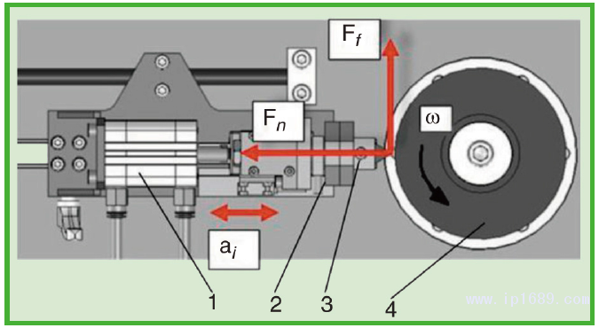 圖3、ICCA測(cè)量原理示意圖,包括:氣動(dòng)裝置(1),兩軸負(fù)載單元(2),固定架加撞擊器(3)和圓形橡膠試樣(4)