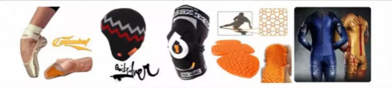D3O沖擊吸收智能材料應用(左起)- 芭蕾舞鞋,頭飾,護膝,滑雪墊,運動服