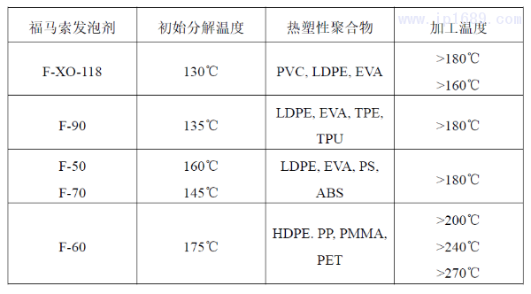 表1 福馬索發(fā)泡劑產(chǎn)品及其分解溫度