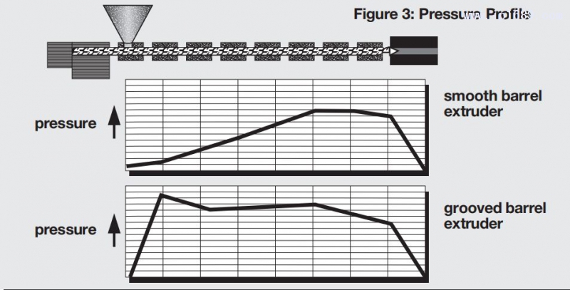 使用有槽的管道能讓擠出機(jī)內(nèi)的相對壓力快速增加(見圖1、3),這對于低熔融溫度環(huán)境中的發(fā)泡劑是有利的。當(dāng)發(fā)泡劑在較早階段就融化了并且開始分解,由于管道前段的高壓作用,分解的氣體能融入熔融物中且在短時(shí)間內(nèi)有很好的分布狀況。