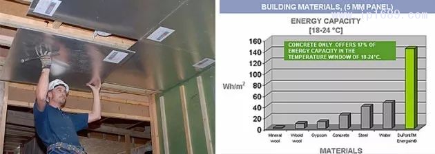 Energain面板安裝(左)/其他材料與Energain材料儲能對比(右)
