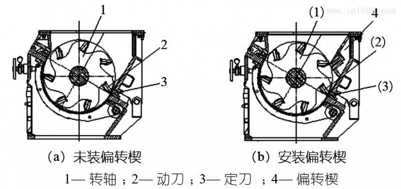 粉碎腔體內(nèi)有未裝偏轉(zhuǎn)楔和安裝偏轉(zhuǎn)楔二種方式,未裝偏轉(zhuǎn)楔時(shí),進(jìn)料強(qiáng)勁有力,物料在粉碎機(jī)內(nèi)的第一次切割通常在4點(diǎn)鐘方向的位置,物料粉碎完以后迅速從篩網(wǎng)孔掉下,出料快、粉碎效率高。安裝偏轉(zhuǎn)楔時(shí),偏轉(zhuǎn)楔與第三把定刀一起安裝在腔體頂部,可降低粉碎機(jī)所承受的沖擊力,起到保護(hù)粉碎機(jī)的作用,物料在粉碎機(jī)內(nèi)的第一次切割通常在2點(diǎn)鐘方向的位置,但是安裝偏轉(zhuǎn)楔和第三把定刀以后增加了切割次數(shù),也增加了物料在腔體內(nèi)的摩擦。廢舊EPS塑料熔點(diǎn)低,在70℃時(shí)開始軟化,故重型粉碎機(jī)不能安裝有偏轉(zhuǎn)楔,否則容易引起EPS物料因摩擦生熱而導(dǎo)致結(jié)塊。
