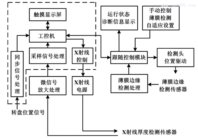 整個X射線測厚儀由薄膜厚度測量和薄膜邊緣跟隨兩部分組成。這兩部分相對獨立,通過一對命令狀態(tài)線協(xié)同工作。