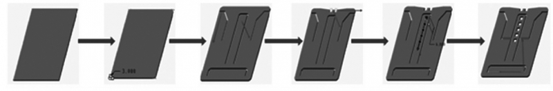 在手機(jī)支架的建模過(guò)程中使用了拉伸、倒角、鏡像、陣列等常用的建模方法,主要的過(guò)程如圖2所示。從零件圖可看出,該支架外形扁平,其結(jié)構(gòu)較為復(fù)雜,長(zhǎng)85mm,寬54mm,總體厚1.3mm,最薄處0.2mm。
