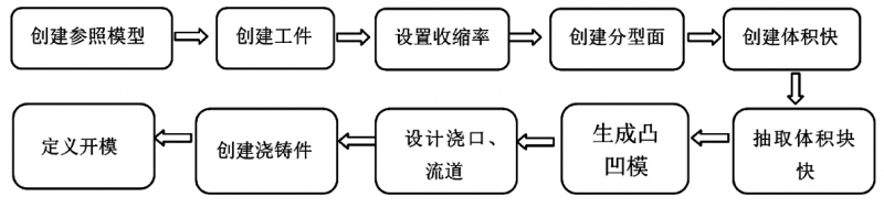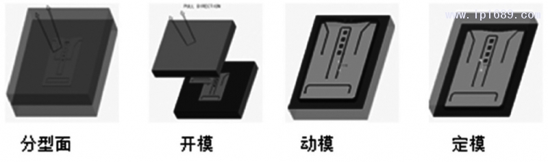 完成產(chǎn)品建模后利用CREO軟件進(jìn)行分模設(shè)計(jì)。分模時(shí)使用了CREO制造模塊下的模具型腔子模塊,流程如圖3所示所示??紤]到該塑件形狀復(fù)雜,模具整體外形尺寸的大小關(guān)系,模具零件加工的難易程度,現(xiàn)決定選用一模一腔的模具結(jié)構(gòu)形式。分型面選在模型的上表面,這樣最主要的成型區(qū)域都留在動(dòng)模板上,方便加工,如圖4所示。