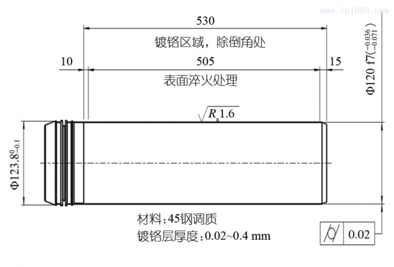 圖 1 是該活塞桿的尺寸簡圖,從簡圖上可以看出, 該活塞桿材料要求為 45# 鋼調質,Ф120 f7(-0.036/- 0.071)段需鍍鉻處理,其表面粗糙度為 Ra1.6,長度為 530 mm,鍍鉻厚度要求 0.02~0.04 mm。同時,鍍鉻 段有較高的尺寸要求(f7)和形狀公差要求(圓柱度 0.02),表面還需淬火處理。