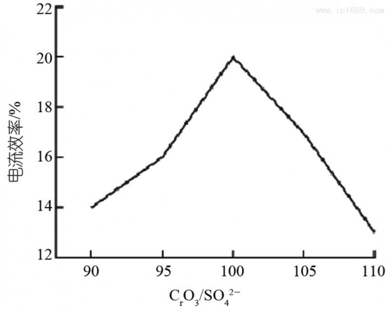 影響很大。當硫酸含量過低時,得不到鍍層或得到的 鍍層很少,主要是棕色氧化物。若硫酸過量時,會造 成覆蓋能力差、電流效率下降,并可能導致局部或全 部沒有鍍層。在確定了鉻酐的質量濃度的基礎上,探 索合理的鉻酐與硫酸的質量濃度比。圖 4 為鉻酐與硫 酸的質量濃度比對電流效率的影響。從圖中可知,當 CrO3/SO42- 為 100:1 時,電流效率最高,且鍍層外觀 質量和性能均較好 ;當 CrO3/SO42- 小于或等于 50:1 時,由于催化劑含量偏高,使陰極膠體膜的溶解速度 大于生成速度,陰極電位也達不到鉻的析出電位,導 致局部、乃至全部沒有鉻的沉積,鍍液的電流效率降 低,分散能力明顯惡化 ;當 CrO3/SO42- 大于 100:1 時, SO42- 含量不足,鍍層的光亮性和鍍液的電流效率降 低,得到的鍍層不均勻,有時發(fā)花,特別是凹處還可 能露出基體金屬。